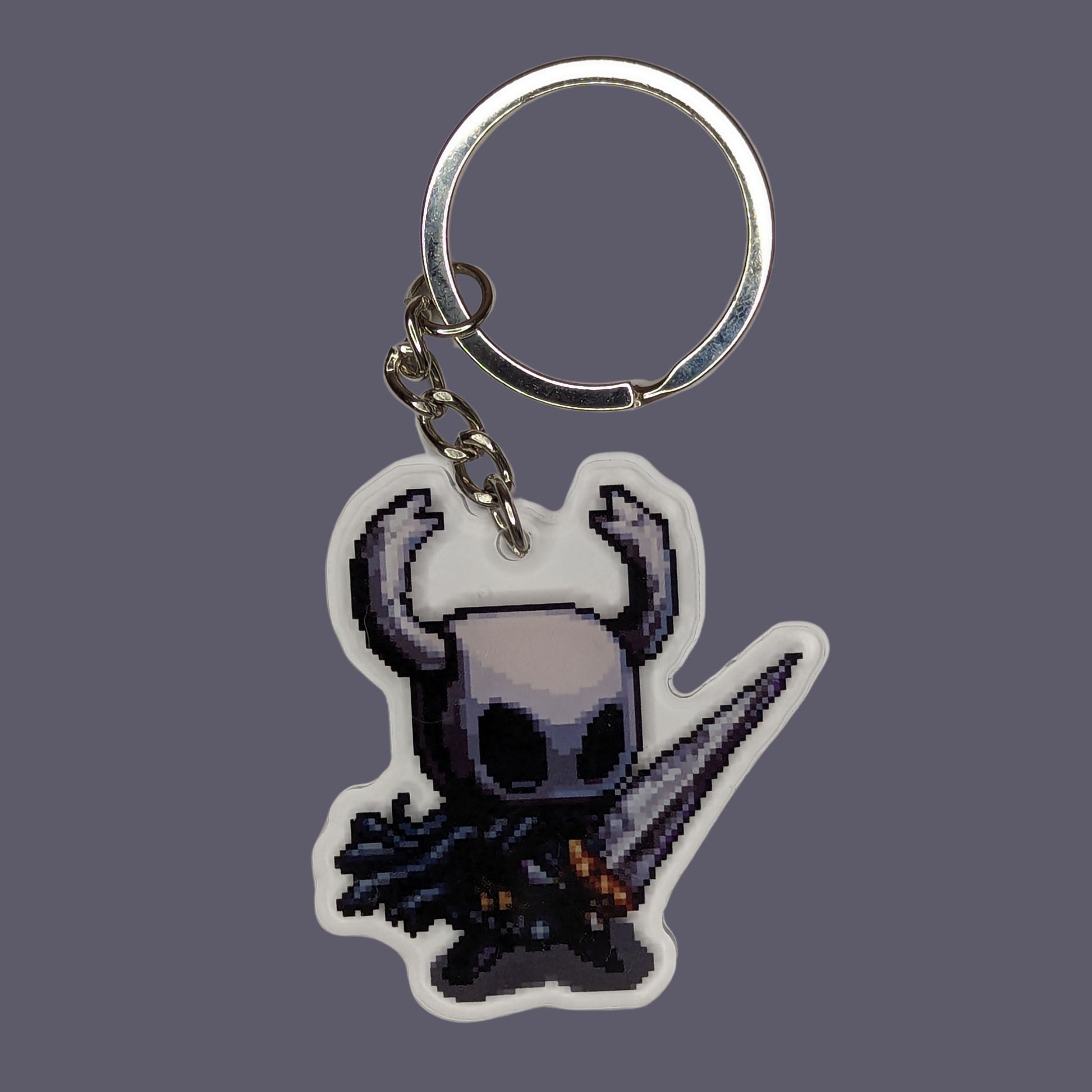 Pixel art double-sided acrylic keychain inspired by the Knight from Hollow Knight! Perfect for bags, purses, keys and more. This collectible indie game decal brings dark fantasy charm to any surface. Great gift for gamers and fans of metroidvania adventures.